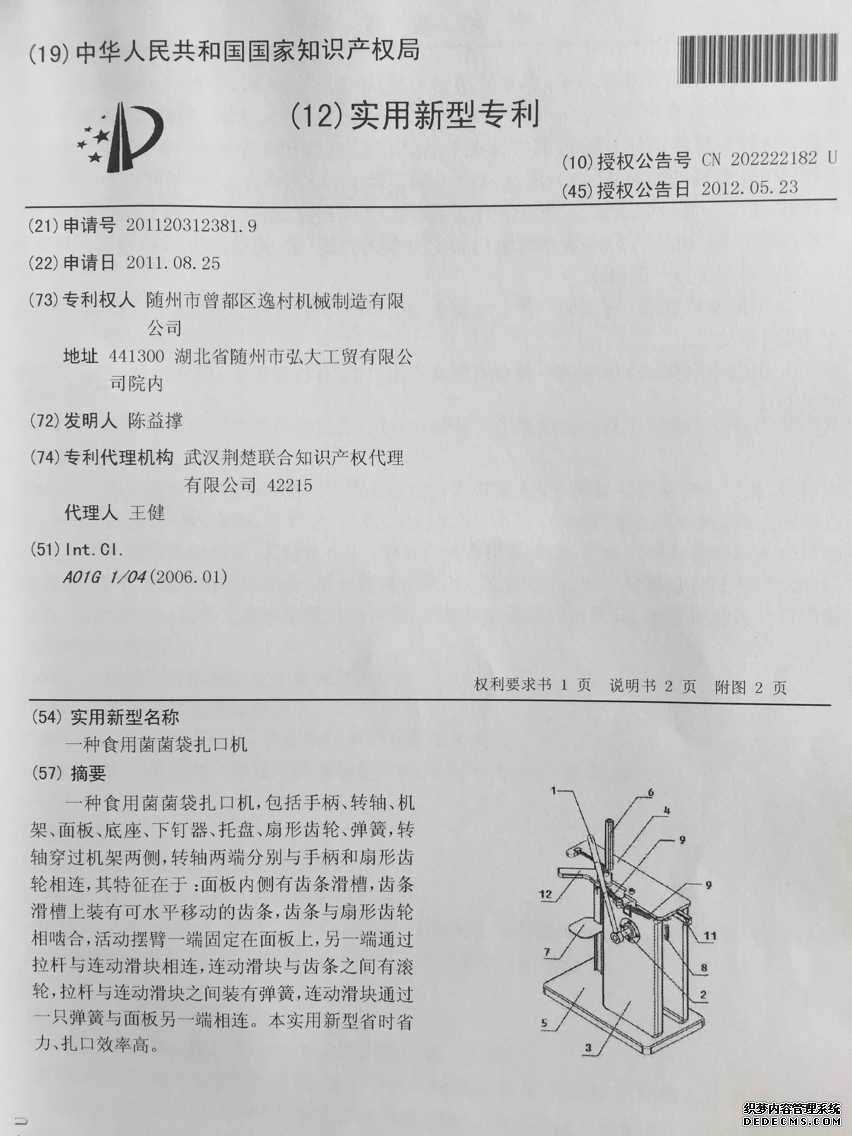 逸村食用菌扎口機榮獲國家實用新型專利證書